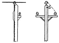 На деревянных опорах заземляющий спуск от штыря изолятора верхнего провода на уровне траверсы отводится от столба для усиления изоляции между спуском и проводами на траверсе.