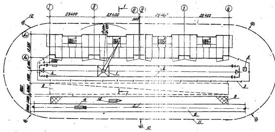 Расположение башенного крана и расстояние подкрановых путей от здания устанавливается при привязке карты в зависимости от объемно-планировочного решения здания и марки крана. Максимальное расстояние от оси движения крана до стены определяется его технической характеристикой, минимальное - условиями безопасности работ в соответствии со СНиП III-4-80* "Техника безопасности в строительстве". Схема расположения монтажного крана приведена на рис. 1, 2.