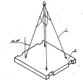 Строповку плит перекрытия при разгрузке и монтаже выполняют траверсой универсальной четырехветвевой за четыре подъемные петли (рис. 3).
