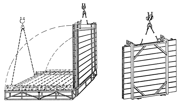 Накладки изготовляют из металлических швеллеров и оборудуют грузоподъемными петлями. Между швеллерами и панелями предусмотрены деревянные прокладки.