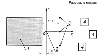 1 - источники шума; 2 - граница стройплощадки; 3 - точка измерений; 4 - застройка