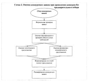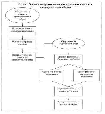 3.1.1 Общий порядок оценки приведен на Схеме 1 в п. 3.2 (в случае проведения конкурса с предварительным квалификационным отбором) и Схеме 2 в п. 3.3 (в случае проведения конкурса без предварительного квалификационного отбора).