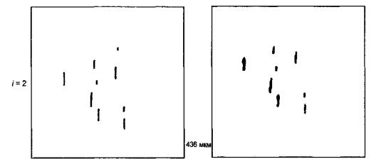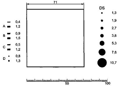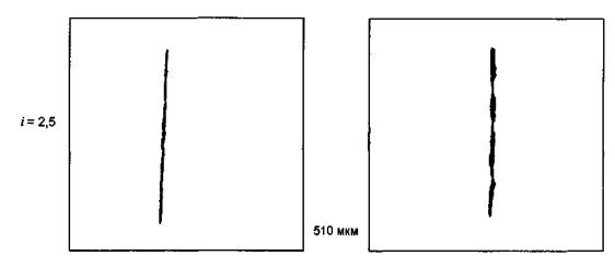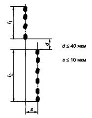 Слева от каждого эталонного изображения указан балл включений i, увеличивающийся от 0,5 до 3 с увеличением длины включения или строчки включений (группы А, В и С) или количества включений (группа D), или их диаметра (группа DS), как указано в таблице 1, а также толщины, как указано в таблице 2. Например обозначение эталонного изображения А2 указывает, что форма включений, наблюдаемых на микроскопе, соответствует группе А, а их распределение и количество соответствует баллу 2.