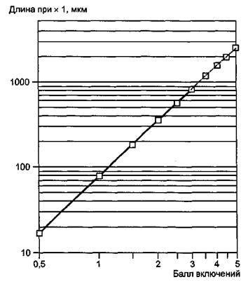 Зависимости между баллами эталонной шкалы и измерениями включений (длиной или диаметром в микрометрах, или количеством на поле) для включений групп А, В, С, D и DS показаны на графиках, приведенных ниже. Для вычисления балла из результата измерения или измеряемых характеристик по баллу, например, если необходимо оценивать включения выше третьего балла, используют следующие выражения.
