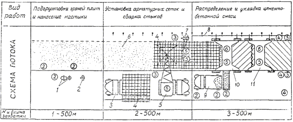 1 - передвижной котел для разогрева битума и емкость для составления грунтовки; 2 - передвижной котел для составления мастики; 3 - автомобиль-каркасовоз; 4 - арматурная сетка; 5 - кран; 6 - песчанобитумный коврик; 7 - сварочный агрегат АСБ-300; 8 - копирная струна; 9 - автомобиль-самосвал КрАЗ-256Б; 10 - распределитель бетона PST-28-300; 11 - бетоноукладчик SF-24-400. Кружками обозначены расстановка рабочих, машинистов и их разряд
