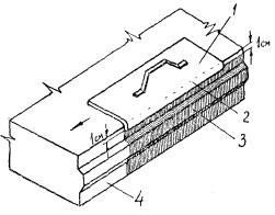 1 - шаблон из листовой стали; 2 - загнутая кромка шаблона высотой 1 см; 3 - грань плиты после нанесения разжиженного битума (или мастики); 4 - грань плиты до нанесения разжиженного битума (или мастики)