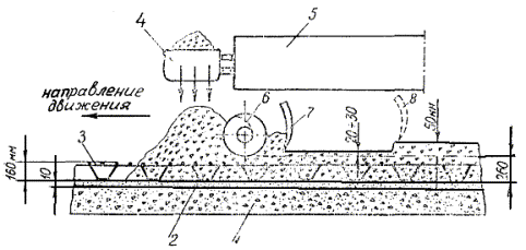 1 - цементобетонное покрытие; 2 - песчанобитумный коврик; 3 - арматурная сетка; 4 - бункер-транспортер; 5 - рама распределителя; 6 - шнеко-фрезерный рабочий орган; 7 - отвал (положение отвала в установившемся потоке); 8 - положение отвала в начале работы