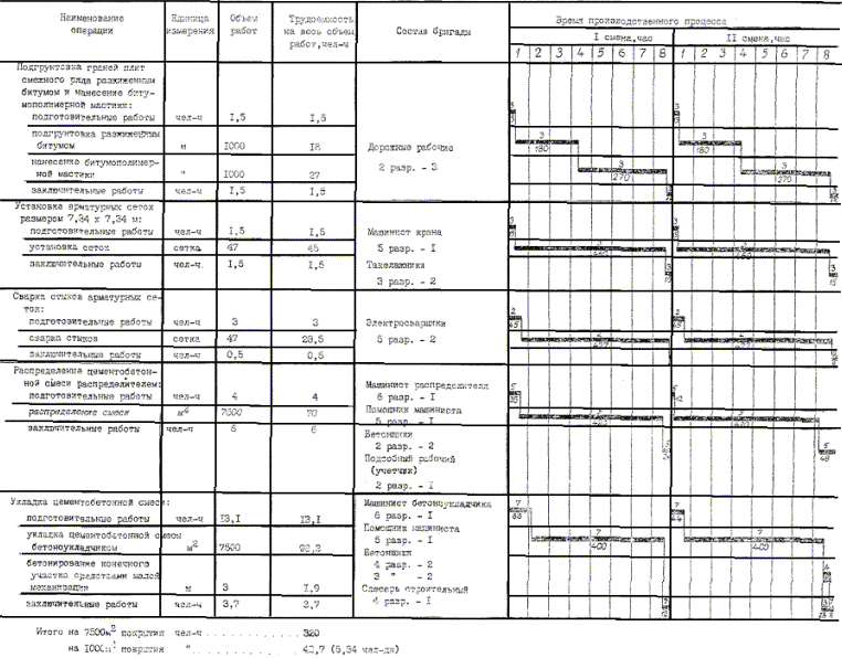 Бригада состоит из пяти звеньев: звена по подгрунтовке граней плит и нанесению мастики; звена по установке арматурных сеток; звена по сварке стыков сетки; звена по распределению цементобетонной смеси и звена по укладке цементобетонной смеси.