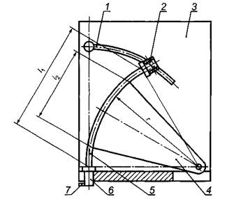 1 - направляющая; 2 - фиксатор; 3 - щит; 4 - шаблон для задания радиуса изгиба; 5 - труба; 6 - фитинг; 7 - соединительный ниппель; l1 - полная длина трубы; l2 - длина опоры изгиба; r - радиус изгиба
