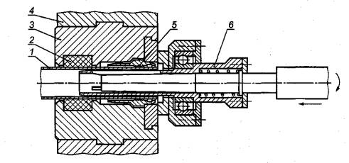 1 - труба; 2 - зажимные полукольца; 3 - сменные полуматрицы; 4 - зажимное устройство; 5 - ниппель; 6 - раскатник