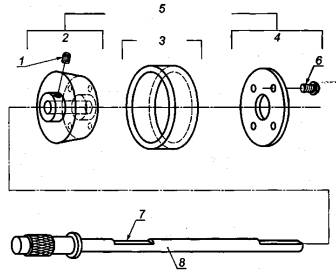 1 - предохранительный винт; 2 - держатель прокладки; 3 - испытательное кольцо; 4 - адаптер испытательного кольца; 5 - распорка; 6 - ведущий вал