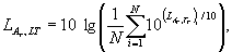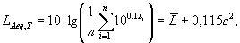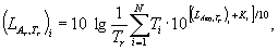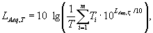 «4.4. Если измерения проведены в каждом из интервалов Ti, ч, и суммарная продолжительность интервалов равна Т, ч, то эквивалентный уровень звука LAeq,Т, дБА, рассчитывают по формуле