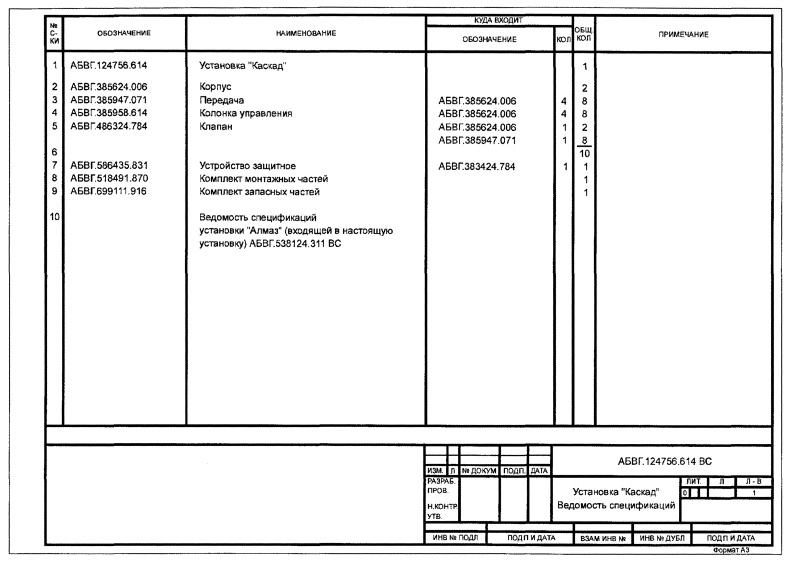 3.5 В разделы «Комплексы», «Сборочные единицы» и «Детали» вносят комплексы, сборочные единицы и детали, непосредственно входящие в специфицируемое изделие. Запись указанных изделий рекомендуется производить в алфавитном порядке сочетания букв кодов организаций-разработчиков.