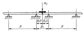 Масса M1 должна быть размещена без динамической нагрузки на верху оболочки у контактного соединения на квадратной жесткой детали со сторонами, равными ширине шинопровода. Масса M1 должна быть равна массе m1 секций шинопровода, включая контактное соединение, которое располагается между опорами на расстоянии D1, плюс дополнительная масса mL1, устанавливаемая изготовителем и равная максимальной нагрузке, создаваемой присоединительной секцией и ответвительным устройством, которые могут быть присоединены на длине D1.