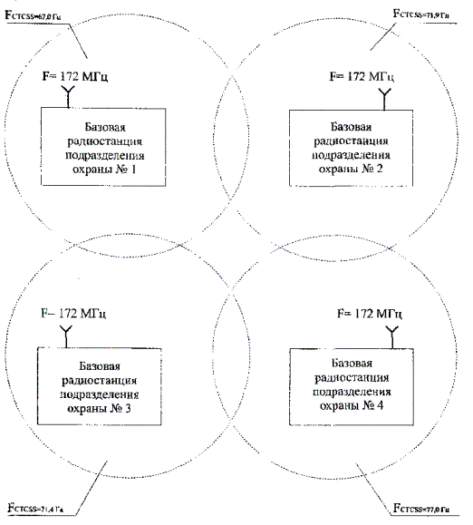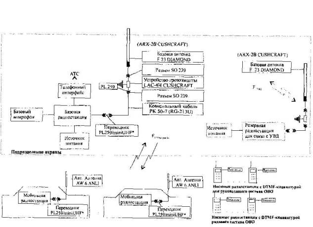 Рисунок 5 - Схема типовой системы радиосвязи подразделения вневедомственной охраны с дистанционным выносом базовой радиостанции с использованием тонового или кодового шумоподавления