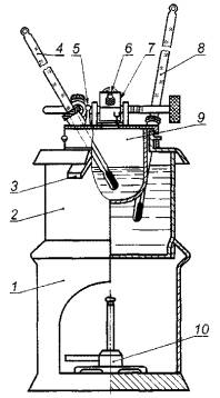 1 - подставка для бани над газовой горелкой; 2 - баня; 3 - славное отверстие; 4 - термометр для тигля; 5 - шаблон для контроля величины пламени; 6 - конус пламени; 7 - паровая камера; 8 - термометр для бани; 9 - испытательный тигель; 10 - газовая горелка