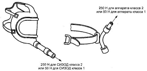 Пояс или ремни крепления с соответствующими соединениями и клапаном непрерывной подачи воздуха (при наличии последнего) закрепляют на туловище манекена, находящемся в вертикальном положении. Вдоль оси шланга подачи воздуха в течение 5 мин прикладывают постоянное растягивающее усилие 1000 Н (для СИЗОД класса 2) и 250 H (для СИЗОД класса 1). Схема испытания прочности шланга подачи воздуха представлена на рисунке 6.