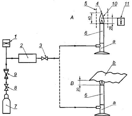А - измерение температуры пламени; В - испытание образца материала; 1 - манометр; 2 - предохранительный клапан; 3 - устройство регулирования давления; 4 - пламя; 5 - экран; 6 - горелка; 7 - баллон с пропаном; 8 - вентиль; 9 - регулятор давления; 10 - термопара; 11-устройство измерения температуры; a) воздушный клапан закрыт; b) испытуемый материал