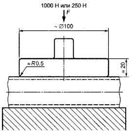 а) две металлические пластины в виде квадрата со стороной 100 мм или две круглые диаметром 100 мм, из которых одна должна быть неподвижна, а другая может перемещаться в направлении, перпендикулярном по отношению к плоскости обеих пластин. Для создания между пластинами давления к подвижной пластине прикладывают нагрузку 250 Н (для СИЗОД класса 1) и 1000 Н (для СИЗОД класса 2). Схема испытания на сплющивание шланга подачи воздуха представлена на рисунке 4;