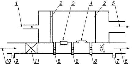 1 - подвод тест-вещества; 2- перегородка; 3 - заглушка; 4 - испытуемый клапан; 5 - отвод тест-вещества; 6 - к дыхательной машине; 7 - проба тест-вещества; 8 - отверстие для измерения давления; 9 - проба тест-вещества; 10 - подвод насыщенного газа; 11 - обратный клапан
