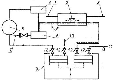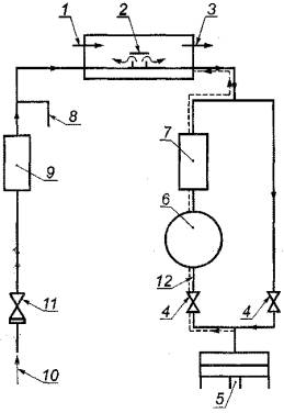 1 - подвод тест-вещества; 2 - испытуемый клапан; 3 - отвод тест-вещества; 4, 6 - фильтры; 5 - проба тест-вещества; 7 - подвод лабораторного воздуха через обратный клапан; 8 - сатуратор; 9 - двухцилиндровая дыхательная машина; 10 - подвод лабораторного газа; 11 - проба тест-вещества; 12 - клапан дыхательной машины