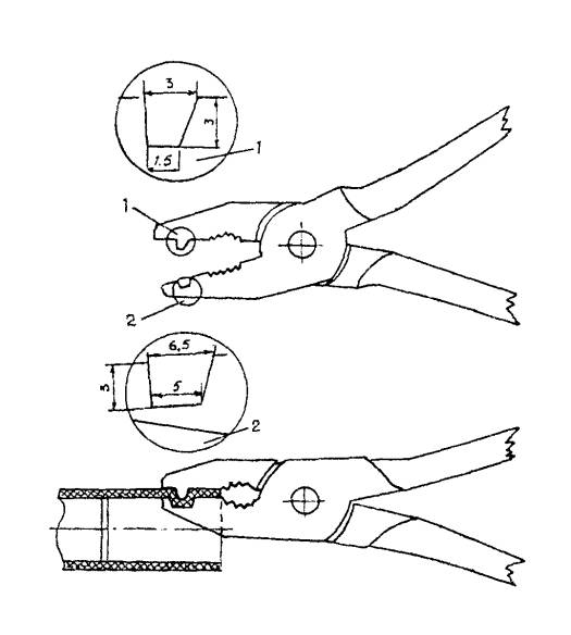 6.7. Выпрессовку фиксирующих выступов в муфтах можно производить пассатижами, в одной из губок которых имеется выступ, а в другой впадина. Сжатием пассатижами стенок без подогрева получают соединительные муфты соответствующих форм и размеров (табл. 21 и рис. 17).