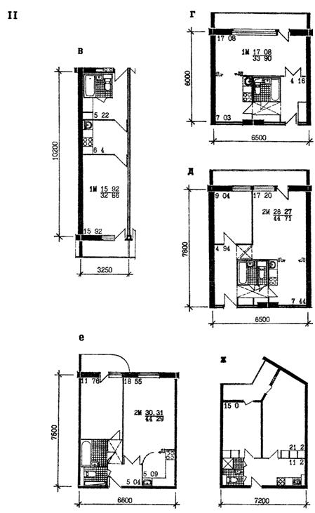 II - в жилище II категории: в - 1-комнатная квартира (МНИИТЭП, проектное предложение); г, д - 1- и 2-комнатные квартиры серии на широком шаге поперечных несущих стен (МНИИТЭП, М4. проектное предложение. Архитекторы Горчаков В. и Староносова Е.); е - 2-комнатная квартира серии М6 (ЭКО) (МНИИТЭП, МЗ, проектное предложение. Архитектор Кан В.) ; ж - жилая ячейка общежития.