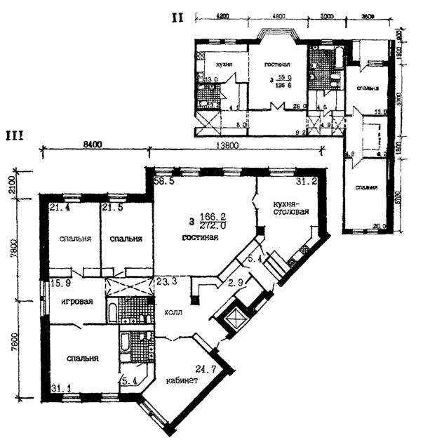 II - в жилом комплексе с обслуживанием и центром реабилитации для молодых инвалидов (МНИИТЭП, М2, стадия "проект". Архитекторы Дадья В., Полетаев Ю. и другие): в - 2-комнатная квартира; г - 3-комнатная квартира.