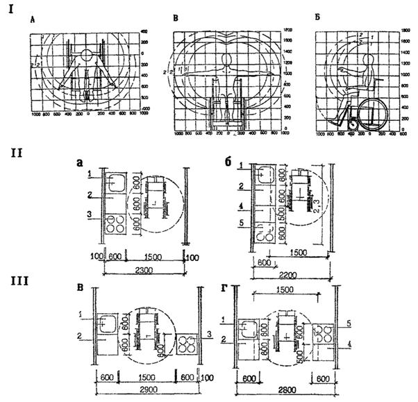 Рис. 41. Решение кухонь в квартирах для инвалидов на кресло-колясках с учетом зон доступности.