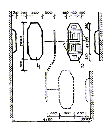 · Ширина участков эвакуации или накопления на остановочных пунктах, где инвалиды могут находиться достаточное время, а также пешеходных путей второстепенного значения, например, у отдельных учреждений «попутного» обслуживания, информационных стендов, киосков, павильонов должна быть увеличена с учетом возможности подъезда и разворота кресла-коляски (черт. 1). На основных пешеходных путях не допускается установка киосков и т. п., препятствующих движению маломобильных пассажиров.