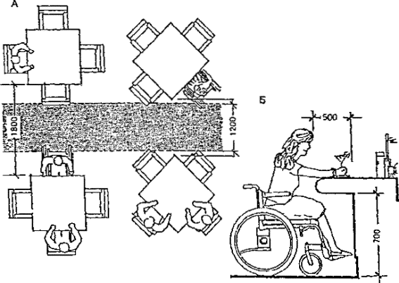 · В кассовых залах расположение и конструктивное решение части окошек касс должны соответствовать антропометрическим параметрам инвалидов на колясках (черт. 7). Часть подвесного или напольного оборудования (кассовые автоматы, телефоны, справочные автоматы и т. п.) должна располагаться на высоте, доступной для инвалида, и размещаться в плане, не создавая помех и опасных препятствий на путях движения, т. е. обеспечить свободный доступ к нему. Расстояние между кассовыми окошками должно составлять не менее 1,6 м.