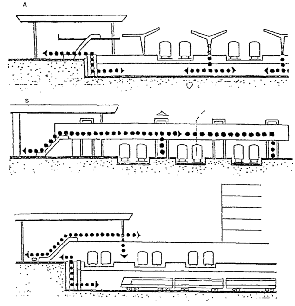 · Для организации рациональных графиков движения пассажиров к поезду широко используются крытые галереи-конкорсы над путями, ведущими к островным платформам. В конкорсе пассажир быстрее ориентируется и располагается ближе к нужной ему платформе. В опорах устраиваются как грузовые подъемники, так и лифты для маломобильных пассажиров.