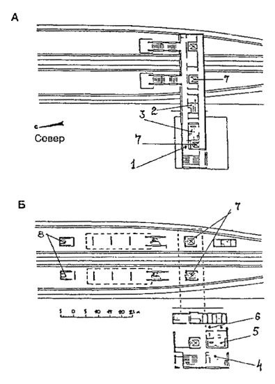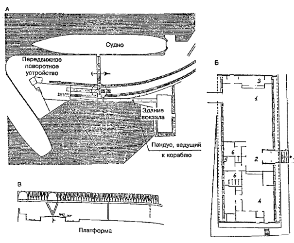 А - генеральный план; Б - здание вокзала; В - фрагмент передвижного поворотного средства; 1 - зал ожидания; 2 - вестибюль; 3 - кафетерий; 4 - административные помещения; 5 - комната отдыха; 6 - санузлы