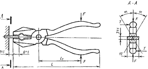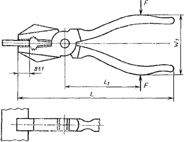 Для испытания на перекусывание проволоку вставляют в губки плоскогубцев (черт. 4) и прикладывают силу F1 к рукояткам в точках, определенных значениями L1 и L2. При этом сила F1 не должна превышать значений, указанных в табл. 2. После испытаний на режущих кромках не должно быть зазубривания и других дефектов, влияющих на работоспособность.