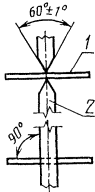 4.8. Испытания на перекусывание проводят на проволоке средней твердости с приблизительной прочностью на растяжение 1600 МПа. Перед испытанием плоскогубцев на перекусывание необходимо провести калибровку проволоки. Для этого устанавливают в испытательное оборудование два твердосплавных резца (черт. 3), кромки которых отшлифованы под углом 60°±1° с радиусом закругления на вершине 0,3 мм, причем режущие кромки должны быть параллельны друг другу и расположены под прямым углом к проволоке для испытаний, фиксируют силу, необходимую для перекусывания. Среднее значение трех измерений должно соответствовать значению F2 = (1800±90) Н (табл. 3).