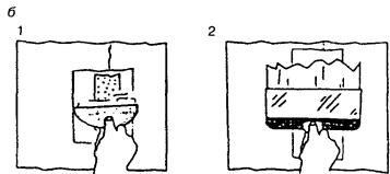 6.9.16 При заделке трещин на ленте, наложенной на стык (рисунок 49, б), удаляют некоторое количество старой шпаклевки с поврежденного участка, наносят шпателем тонкий слой шпаклевки вокруг поврежденного участка и вдавливают им ленту (рисунок 49, б1) для заделки стыков в шпаклевку, а после разравнивания (рисунок 49, б2) и твердения операции выполняют в соответствии с указаниями 6.9.4.
