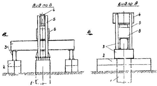 1 – испытываемые оболочка или столб; 2 – опора балки; 3 – упорные балки; 4 – верхний упор; 5 – анкерные тяги; 6 – гидравлический домкрат