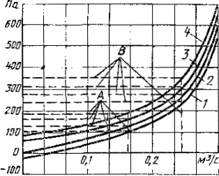А - минимально допустимые значения избыточного давления и расхода защитного газа при которых должны срабатывать блокировки; В - минимальные значения избыточного давления и расхода защитного газа при нормальной работе электродвигателя с учетом значения дифференциала прибора контроля избыточного давления