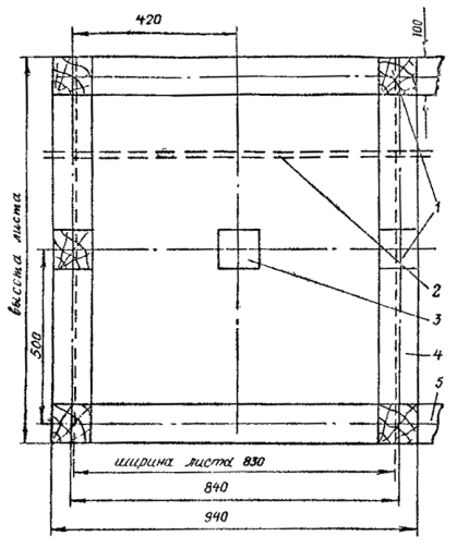 1 - деревянные вставки; 2 - асбестоцементный лист; 3 - марка 100 ´ 100 мм; 4 - вертикальный маяк; 5 - горизонтальный маяк