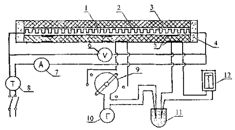 1 - стальная труба; 2 - электронагреватель; 3 - испытуемый материал; 4 - изоляция; 5 - термопары; 6 - вольтметр; 7 - амперметр; 8 - автотрансформатор; 9- переключатель; 10 - гальванометр; 11 - сосуд со льдом; 12 - самопишущий гальванометр.