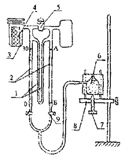 1 - манометр с дибутилфталатом; 2 - ртутный манометр; 3 - камера; 4 - образец; 5 - воздушный кран; 6 - колба с ртутью; 7 - винт; 8 - подставка; 9- кран