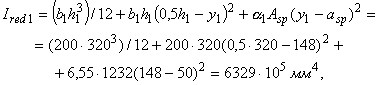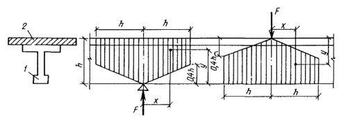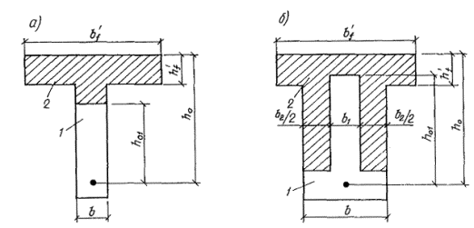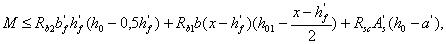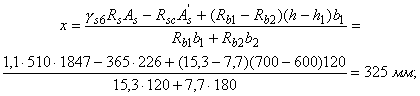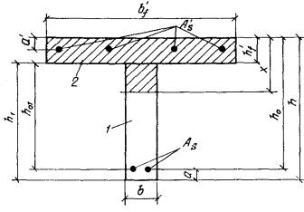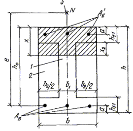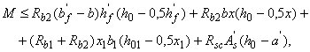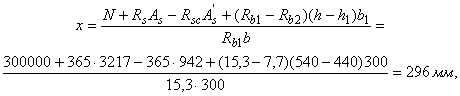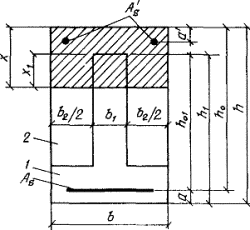 б) если граница сжатой зоны проходит в полке и пересекает участок из другого бетона, т. е. соблюдаются условия и x>h-h1