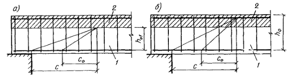 а - треугольные; б - прямоугольные; 1 - сборный элемент; 2 - монолитный бетон