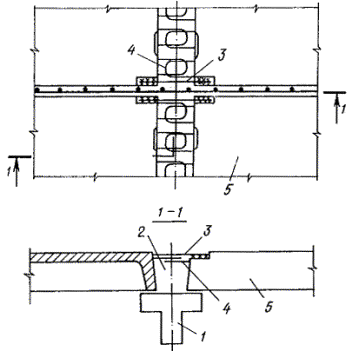 1 - ригель; 2 - монолитный бетон; 3 - надопорная арматура; 4 - выпуски арматуры из плит; 5 - плита