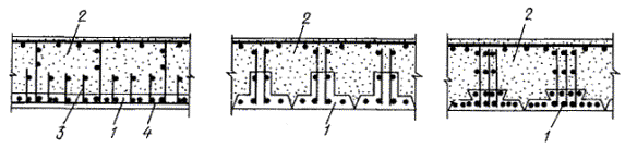1 - сборные преднапряженные элементы; 2 - монолитный бетон; 3 - дополнительная поперечная арматура; 4 - сетка