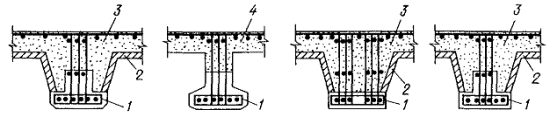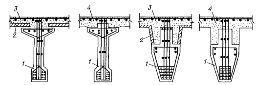 1 - сборные преднапряженные балки неполного сечения; 2 - сборные плиты плоские и коробчатого профиля; 3 - монолитный бетон; 4 - монолитный бетон по подвесной опалубке