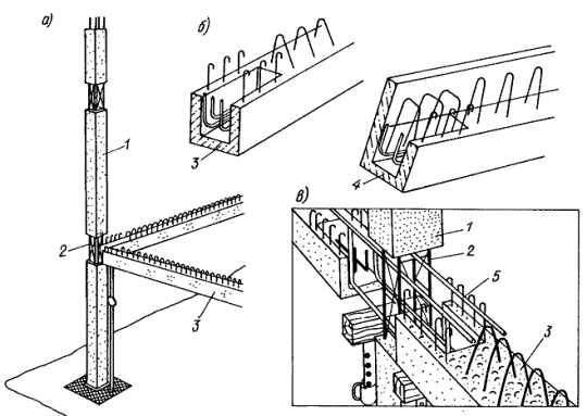 SCOP PPB (а), опорные зоны балок (б) и узловое соединение элементов каркаса (в); 1 - многоэтажная колонна SCOP; 2 - обнаженная арматура колонны; 3 - балка перекрытия; 4 - фундаментная балка; 5 - арматура узлового соединения
