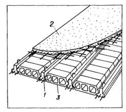 1 - преднапряженные балки; 2 - слой монолитного бетона; 3 - пустотные блоки межбалочного заполнения