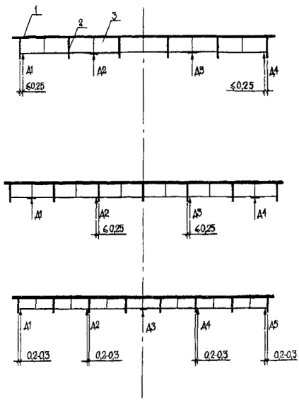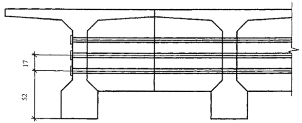 3.1.3. Количество поперечных канатов класса К-7 в пролетных строениях определяется расчетом, а для типовых конструкций приведено в таблице 3.1 с указанием числа сечений, где устанавливаются канаты (числа диафрагм), и количества канатов в каждом сечении. Данные таблицы получены на основании перерасчетов типовых пролетных строений с повреждениями в диафрагмах (разрывы по накладкам и диафрагмам по всей длине), и продольных швах омоноличивания (разрушен бетон швов настолько, что связь между балками рассматривается как шарнирная).