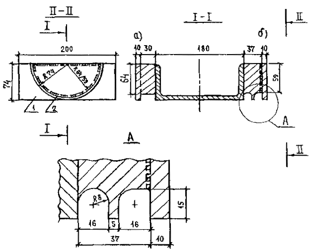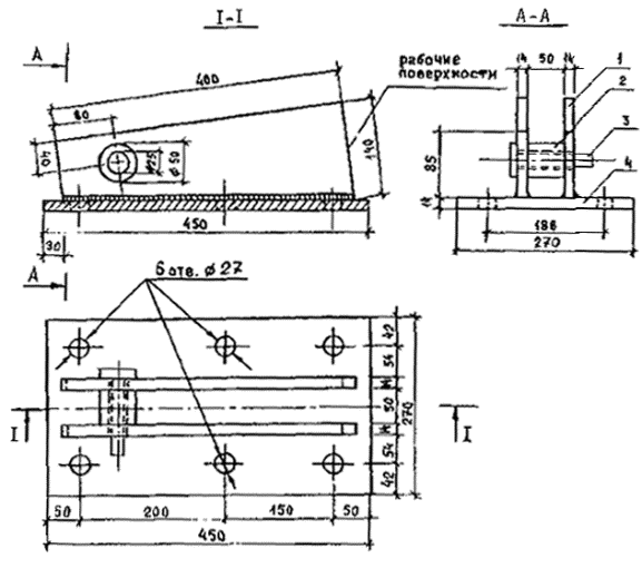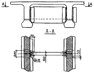 Максимальное усилие, которое может передать внутренний упор на бетон типовой балки, составляет 30 тс. Толщина стенки в типовых балках составляет величину от 15 до 20 см, а класс бетона по прочности на сжатие равен В20-В30 (250 - 400 кгс/см). Расчеты на смятие бетона и местные напряжения в бетоне под упором показали, что диаметр внутреннего цилиндрического упора должен быть не менее 80-100 мм (в зависимости от класса бетона), а накладной упор должен крепиться к стенке балки шестью болтами диаметром 24-25 мм.